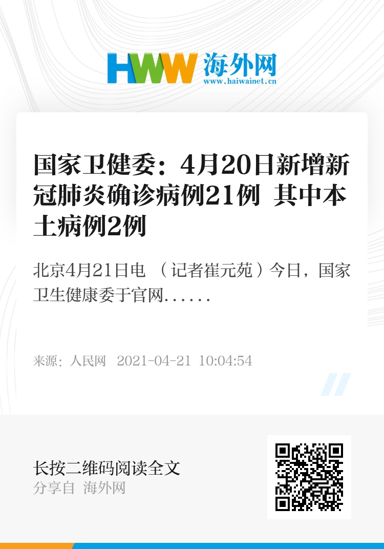 人民网北京4月21日电 (记者崔元苑)今日,国家卫生健康委于官网发布了截至4月20日24时新型冠状病毒肺炎疫情最新情况。4月20日0―24时,31个省(自治区、直辖市)和新疆生产建设兵团报告新增确诊病例21例,其中境外输入病例19例(海南12例,上海3例,天津2例,广东1例,四川1例),本土病例2例(均在云南);无新增死亡病例;无新增疑似病例。