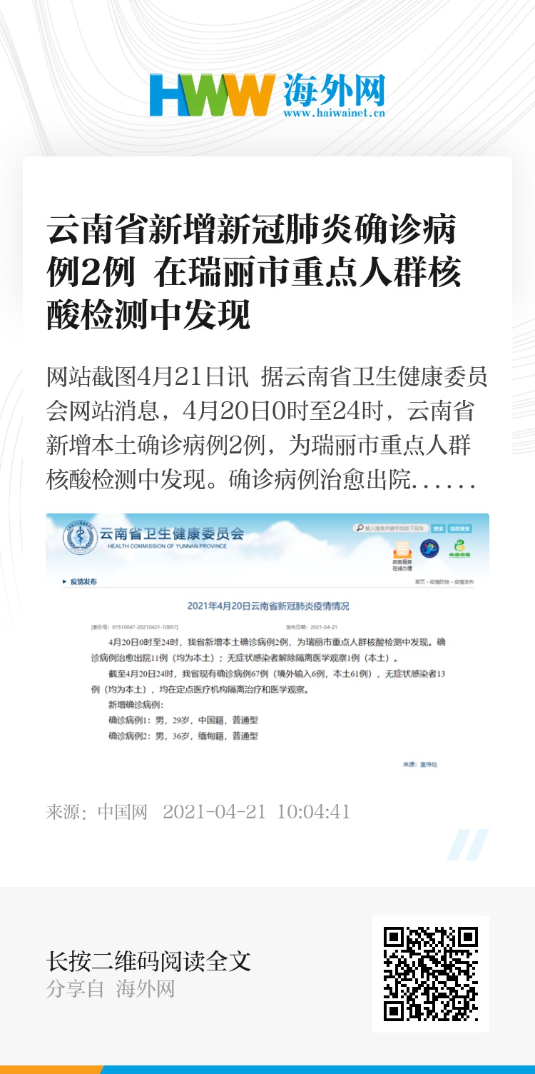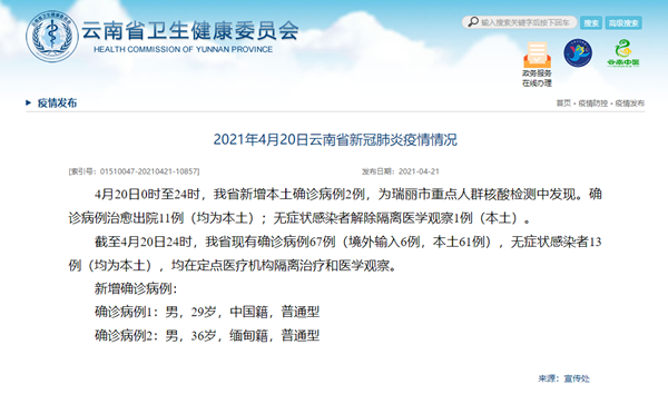 中国网4月21日讯 据云南省卫生健康委员会网站消息,4月20日0时至24时,云南省新增本土确诊病例2例,为瑞丽市重点人群核酸检测中发现。确诊病例治愈出院11例(均为本土);无症状感染者解除隔离医学观察1例(本土)。