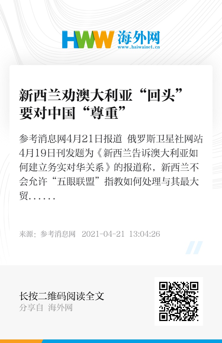 参考消息网4月21日报道 俄罗斯卫星社网站4月19日刊发题为《新西兰告诉澳大利亚如何建立务实对华关系》的报道称,新西兰不会允许“五眼联盟”指教如何处理与其最大贸易伙伴中国的关系。新西兰外长马胡塔认为,希望“五眼联盟”专注于情报分享,不乐见其扩大其职权范围。