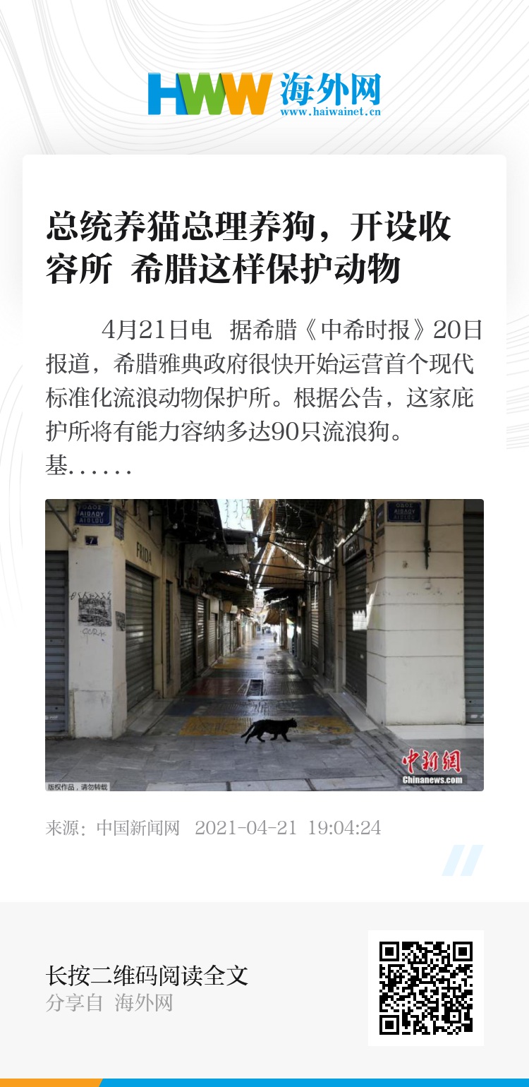 中新网4月21日电 据希腊《中希时报》20日报道,希腊雅典政府很快开始运营首个现代标准化流浪动物保护所。根据公告,这家庇护所将有能力容纳多达90只流浪狗。基础设施将包括宽敞的庭院和娱乐设施,得以使工作人员在体面和安全的条件下,安置流浪动物们。此外,前几天,希腊总理收养了一只流浪狗,作为总理府首只“总理宠物狗”,而总统也于去年收养了一只猫。