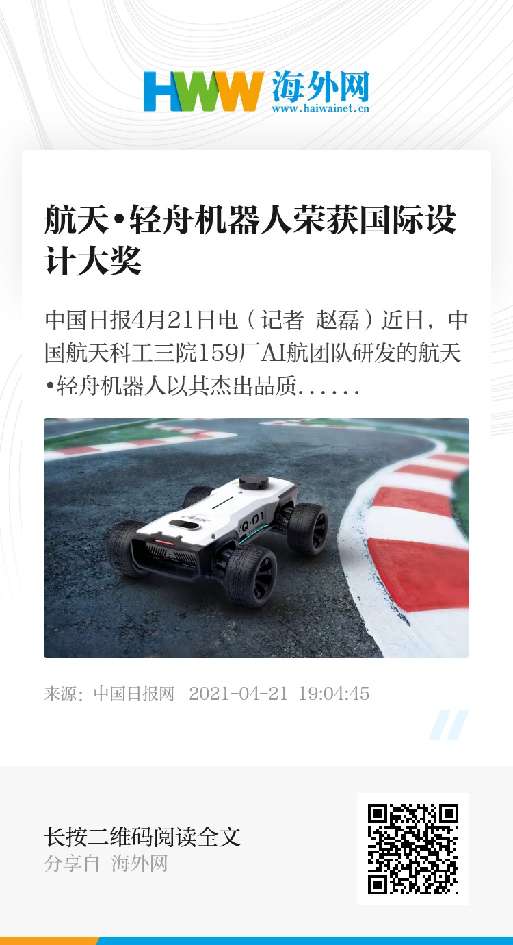 中国日报4月21日电(记者 赵磊)近日,中国航天科工三院159厂AI航团队研发的航天•轻舟机器人以其杰出品质、细腻做工、丰富功能和优越的拓展性荣获国际工业设计领域的大奖 -- iF设计奖。