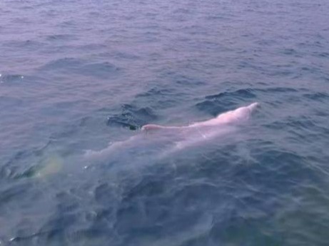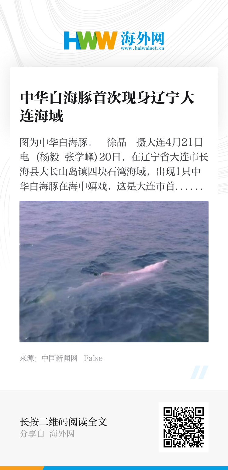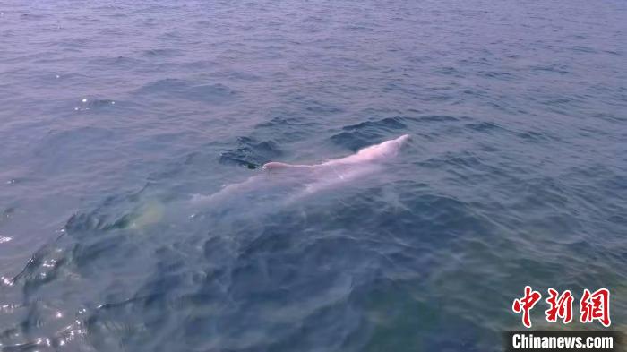 中新网大连4月21日电 (杨毅 张学峰)20日,在辽宁省大连市长海县大长山岛镇四块石湾海域,出现1只中华白海豚在海中嬉戏,这是大连市首次在北黄海地区观测到存活的中华白海豚。