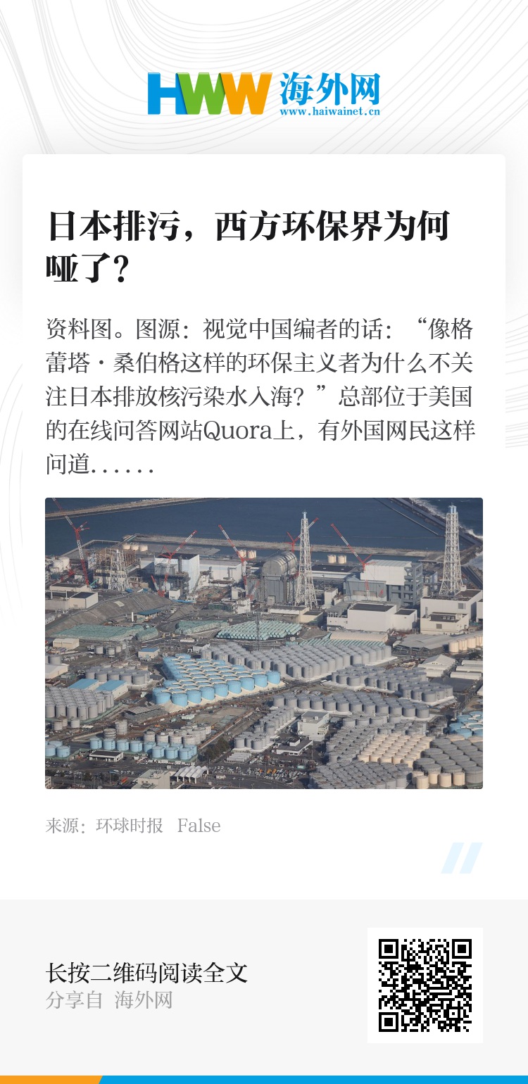 编者的话:“像格蕾塔·桑伯格这样的环保主义者为什么不关注日本排放核污染水入海?”总部位于美国的在线问答网站Quora上,有外国网民这样问道。这也是很多人的困惑。对于日本决定向海洋排放核污染水,近年来异常活跃的瑞典“环保少女”却未发表任何看法。不仅桑伯格有些“反常”,众多西方环保组织此次都很低调——除了总部位于荷兰的绿色和平组织,在国际媒体报道中很难找到其他对日本灾难性做法表示反对的西方环保组织的名字。动不动对发展中国家环保问题严词批判的西方环保组织,为何这次哑了?“与上世纪70年代相比,很多环保组织已缺乏环保激情,承载着更多所谓政治性、意识形态等负担。”德国环保政策学者克劳菲特对《环球时报》记者表示,他们如今更像是游说组织,帮助一些利益集团争取话语权。