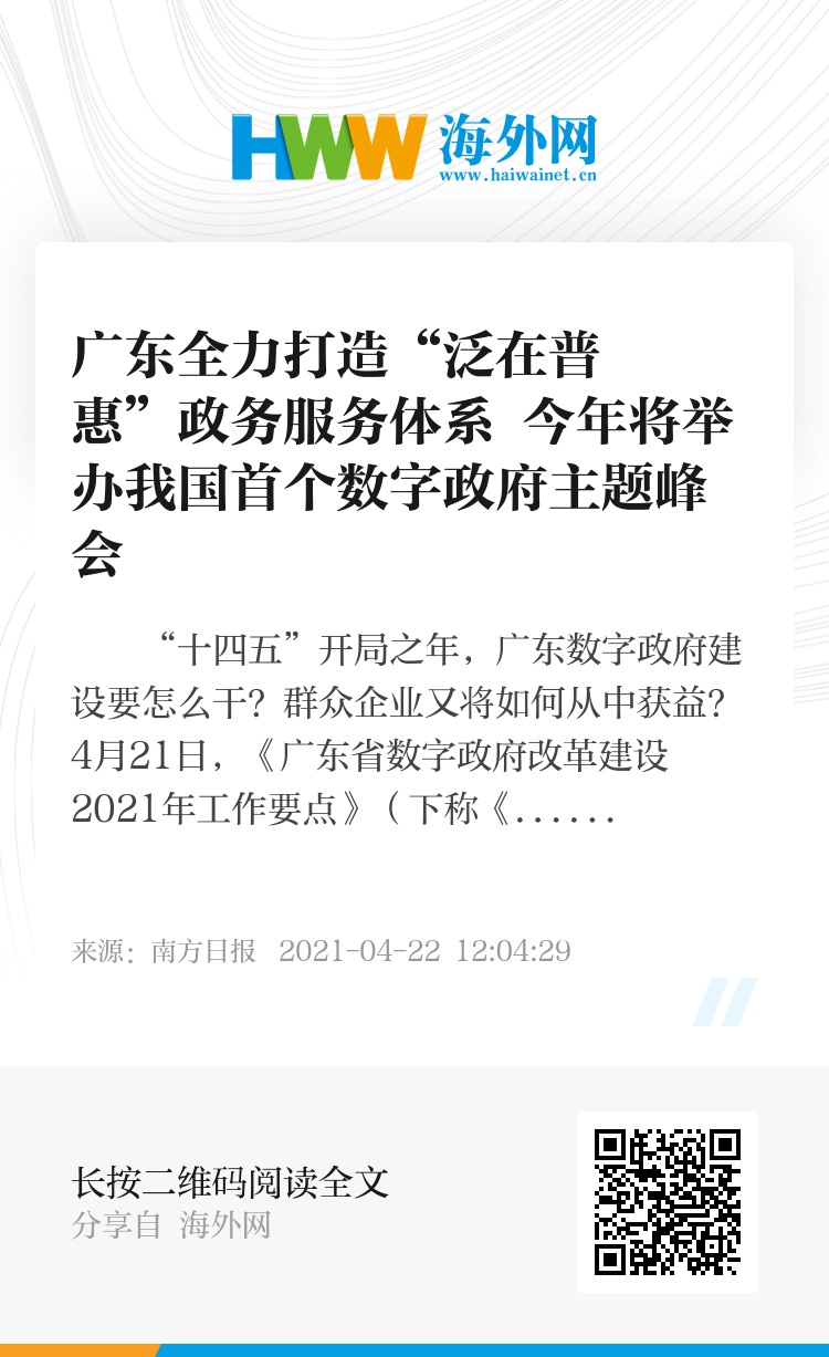今年,广东还将举办我国首个以数字政府改革建设为主题的峰会。本次峰会以“建设数字政府 加快数字化发展”为主题,将于今年8月27日至28日在广州举行。