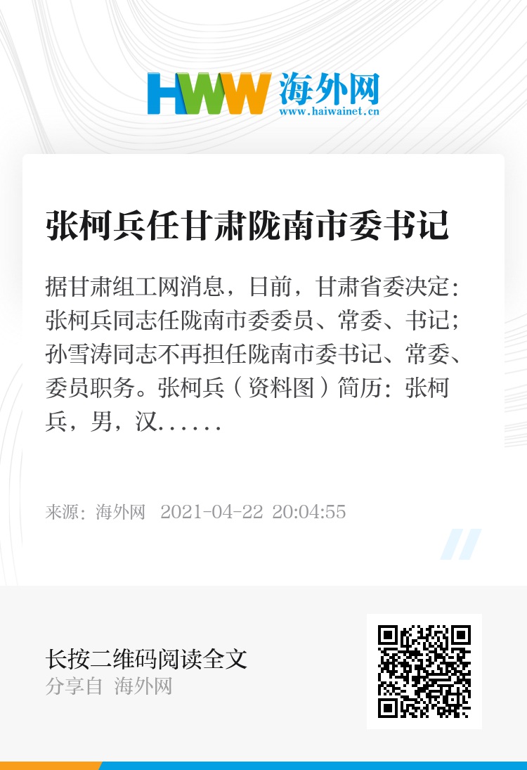 据甘肃组工网消息,日前,甘肃省委决定:张柯兵同志任陇南市委委员、常委、书记;孙雪涛同志不再担任陇南市委书记、常委、委员职务。