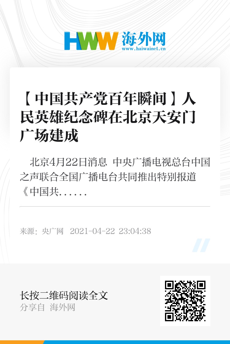 央广网北京4月22日消息 中央广播电视总台中国之声联合全国广播电台共同推出特别报道《中国共产党百年瞬间》。本期推出:人民英雄纪念碑在北京天安门广场建成。