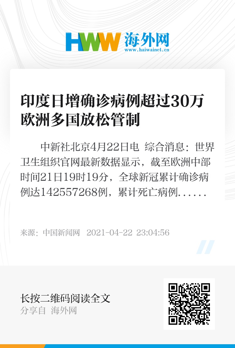 中新社北京4月22日电 综合消息:世界卫生组织官网最新数据显示,截至欧洲中部时间21日19时19分,全球新冠累计确诊病例达142557268例,累计死亡病例3037398例。另据美国约翰斯·霍普金斯大学最新统计数据显示,截至北京时间4月22日12时20分,全球累计确诊病例143528162例,累计死亡病例3056040例。
