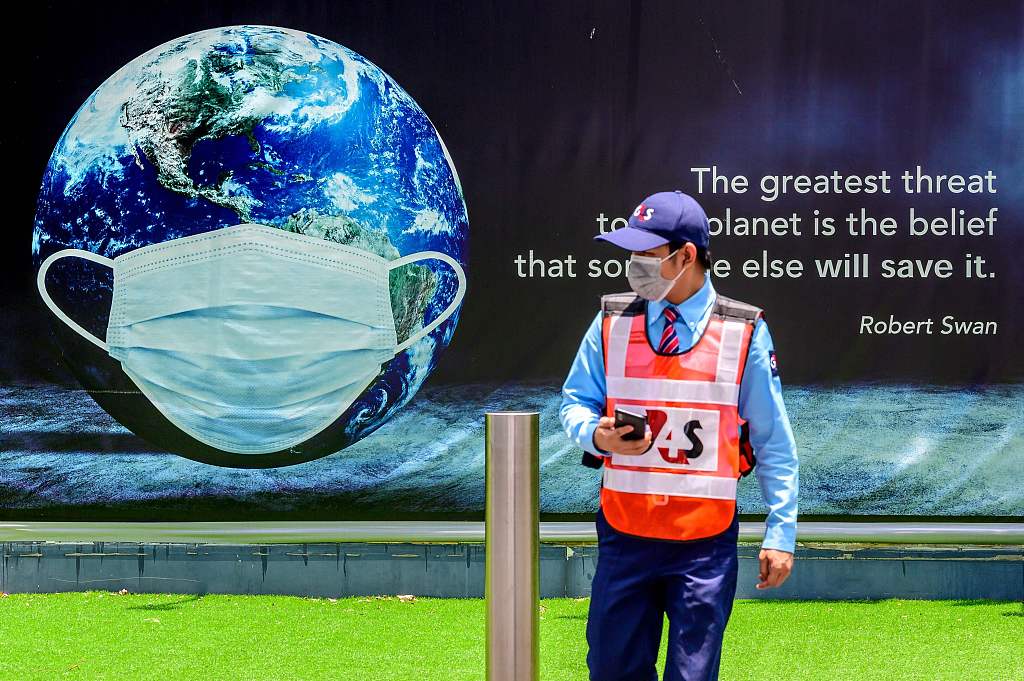 图为当地时间4月22日,泰国首都曼谷张贴一张地球佩戴口罩的海报。