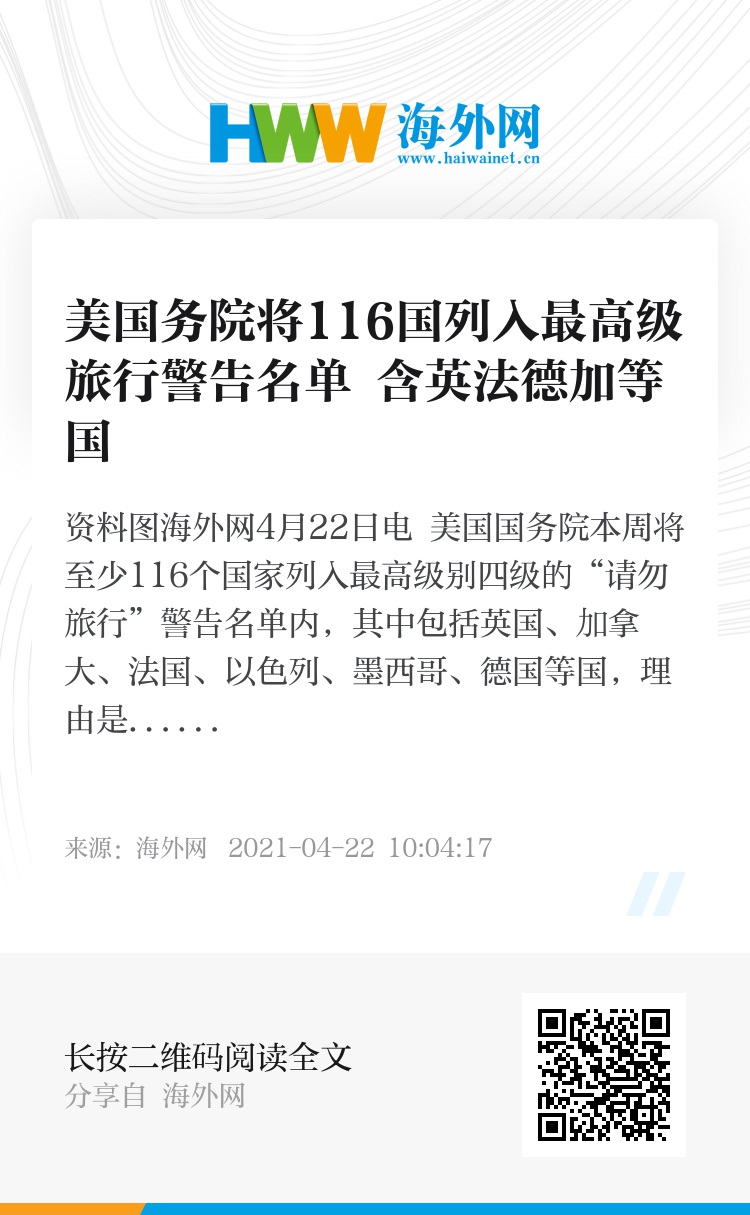 海外网4月22日电 美国国务院本周将至少116个国家列入最高级别四级的“请勿旅行”警告名单内,其中包括英国、加拿大、法国、以色列、墨西哥、德国等国,理由是这些国家“新冠疫情形势非常严峻”。