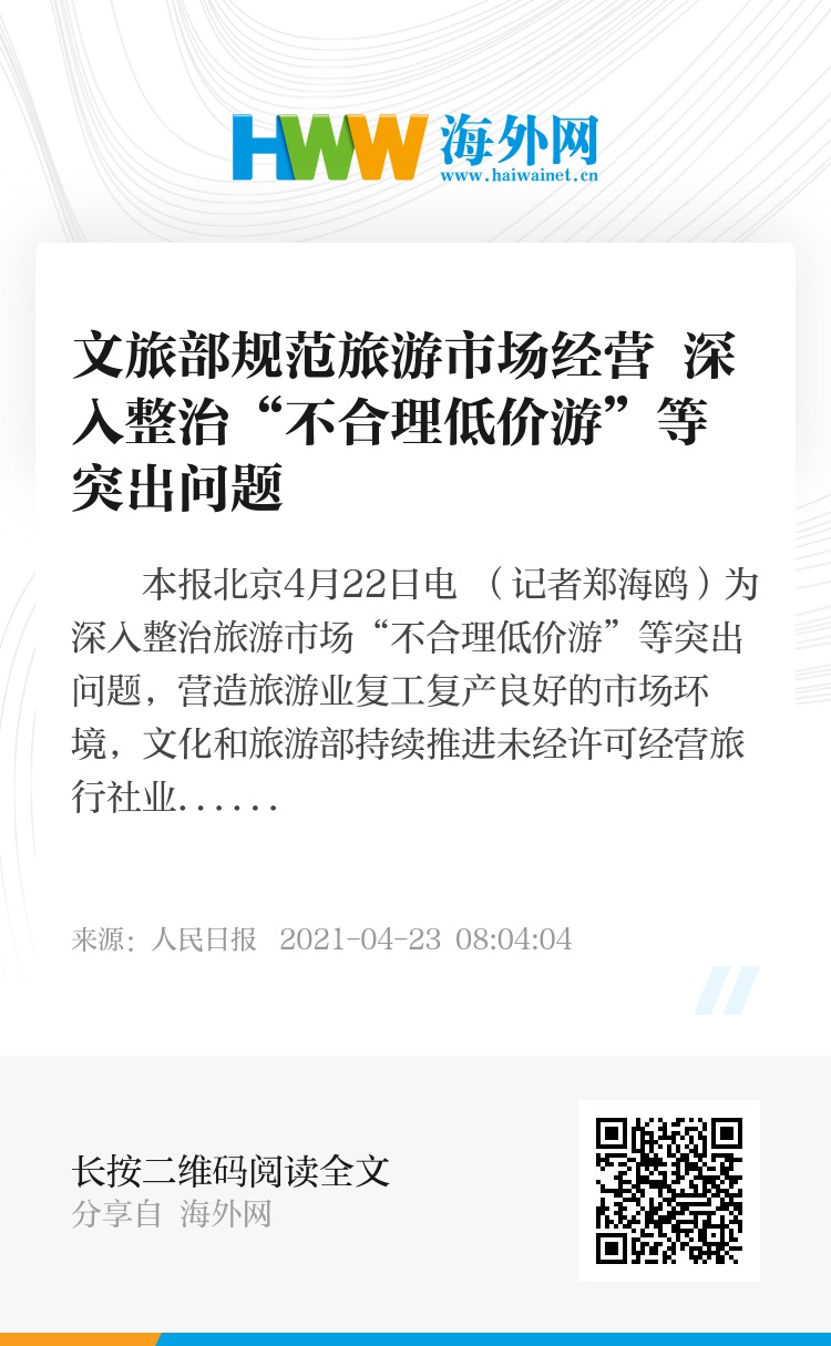 本报北京4月22日电 (记者郑海鸥)为深入整治旅游市场“不合理低价游”等突出问题,营造旅游业复工复产良好的市场环境,文化和旅游部持续推进未经许可经营旅行社业务专项整治行动,严查在线旅游市场,整治通过互联网开展旅行社业务的违法违规经营行为,有力地规范了旅游市场经营秩序。