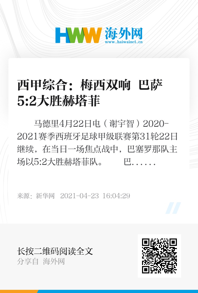 新华社马德里4月22日电(谢宇智)2020-2021赛季西班牙足球甲级联赛第31轮22日继续,在当日一场焦点战中,巴塞罗那队主场以5:2大胜赫塔菲队。