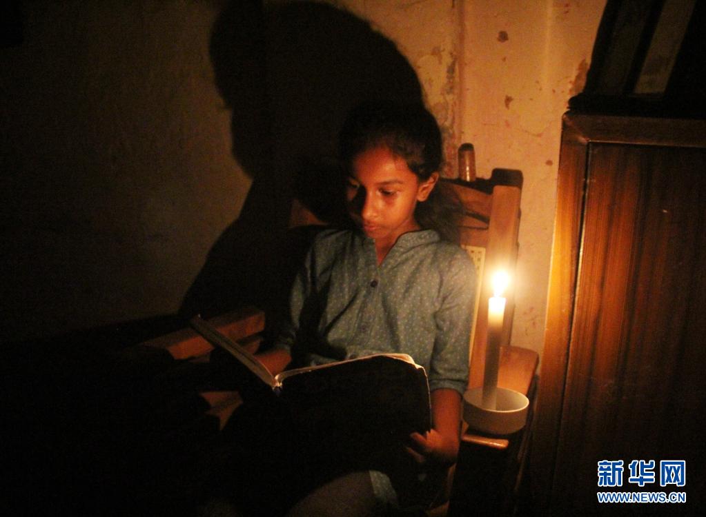 这是2020年8月17日,在斯里兰卡科伦坡,一名学生在停电后依靠烛光继续读书。新华社发(哈普拉彻奇摄)