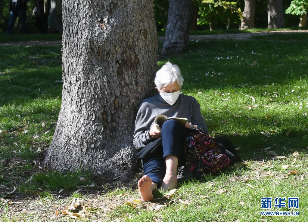4月17日,一位老人在西班牙马德里一个公园内读书。   新华社发(古斯塔沃·巴连特摄)