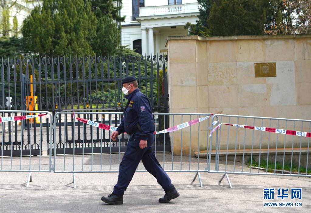4月22日,警察在捷克首都布拉格俄罗斯驻捷克使馆外执勤。新华社发(达娜·科什奈洛娃摄)