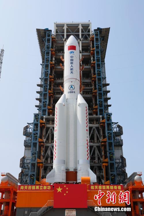 4月23日,中国空间站天和核心舱与长征五号B遥二运载火箭组合体已转运至发射区,后续将按计划开展发射前的各项功能检查、联合测试等工作。郭文彬 摄