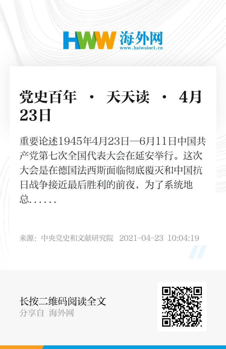 中国共产党第七次全国代表大会在延安举行。这次大会是在德国法西斯面临彻底覆灭和中国抗日战争接近最后胜利的前夜,为了系统地总结中国革命的基本经验,为彻底打败日本侵略者、建设新中国做准备的历史条件下召开的。毛泽东在开幕词中指出:我们这次大会是关系全中国四亿五千万人民命运的一次大会。我们这个大会要打倒日本帝国主义,把全中国人民解放出来。这个大会是一个打败日本侵略者、建设新中国的大会,是一个团结全中国人民、团结全世界人民、争取最后胜利的大会。我们的大会是处在反法西斯战争最后胜利的前夜。在中国人民面前摆着两条路,光明的路和黑暗的路。有两种中国之命运,光明的中国之命运和黑暗的中国之命运。现在日本帝国主义还没有被打败。即使把日本帝国主义打败了,也还是有这样两个前途。或者是一个独立、自由、民主、统一、富强的中国,就是说,光明的中国,中国人民得到解放的新中国;或者是另一个中国,半殖民地半封建的、分裂的、贫弱的中国,就是说,一个老中国。一个新中国还是一个老中国,两个前途,仍然存在于中国人民的面前,存在于中国共产党的面前,存在于我们这次代表大会的面前。我们的任务不是别的,就是放手发动群众,壮大人民力量,团结全国一切可能团结的力量,在我们党领导之下,为着打败日本侵略者,建设一个光明的新中国,建设一个独立的、自由的、民主的、统一的、富强的新中国而奋斗。我们应当用全力去争取光明的前途和光明的命运,反对另外一种黑暗的前途和黑暗的命运。我们的任务就是这一个!这就是我们大会的任务,这就是我们全党的任务,这就是全中国人民的任务。一个强大的中国共产党,一个强大的解放区,全国人民的援助,国际人民的援助,在这些条件下,我们的希望是能够实现的。我们需要一个正确的政策。这个政策的基本点,就是放手发动群众,壮大人民的力量,在我们党领导之下,打败侵略者,建设新中国。到了现在,我们的党已经成了中国人民抗日救国的重心,已经成了中国人民解放的重心,已经成了打败侵略者、建设新中国的重心。中国的重心不在任何别的方面,而在我们这一方面。我们应该谦虚,谨慎,戒骄,戒躁,全心全意地为中国人民服务,在现时,为着团结全国人民战胜日本侵略者,在将来,为着团结全国人民建设新民主主义的国家。这次大会,是中国共产党在新民主主义革命时期召开的极其重要的也是最后的一次代表大会。它全面而深入地总结了中国新民主主义革命二十多年曲折发展的历史经验,制定了正确的路线、方针和政策,使全党特别是党的高级干部对于新民主主义革命的发展规律有了比较明确的认识,从而使全党在马克思列宁主义、毛泽东思想的基础上达到了空前的团结,为争取抗日战争的胜利和新民主主义革命在全国的胜利,奠定了政治上、思想上和组织上的基础。这篇开幕词收入《毛泽东选集》第三卷,题为《两个中国之命运》。