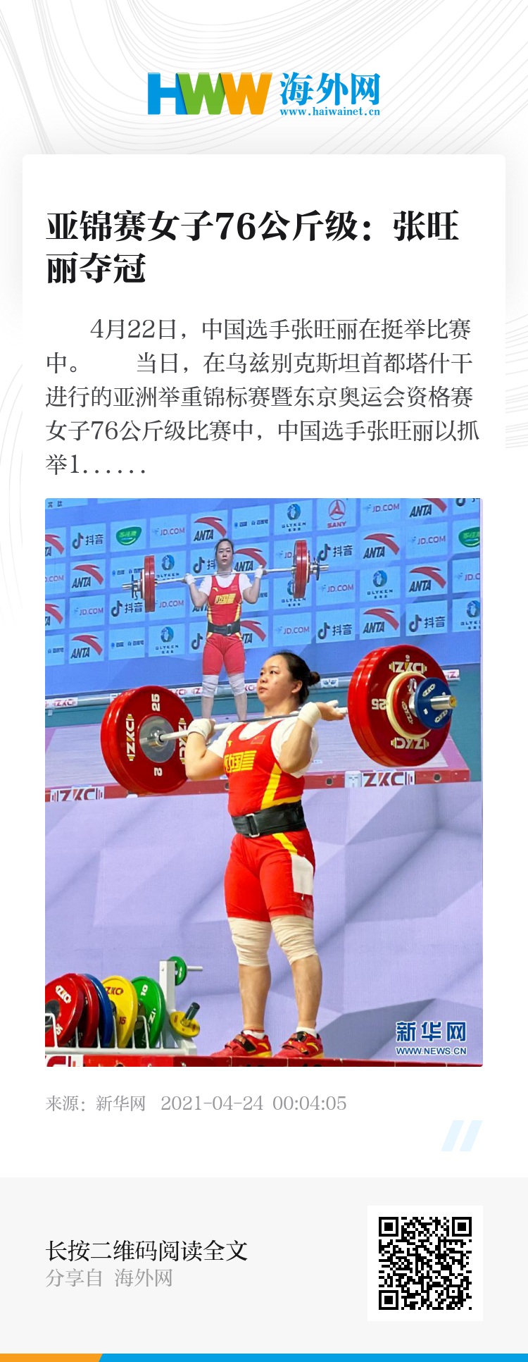 当日,在乌兹别克斯坦首都塔什干进行的亚洲举重锦标赛暨东京奥运会资格赛女子76公斤级比赛中,中国选手张旺丽以抓举115公斤、挺举148公斤、总成绩263公斤的成绩包揽三枚金牌。