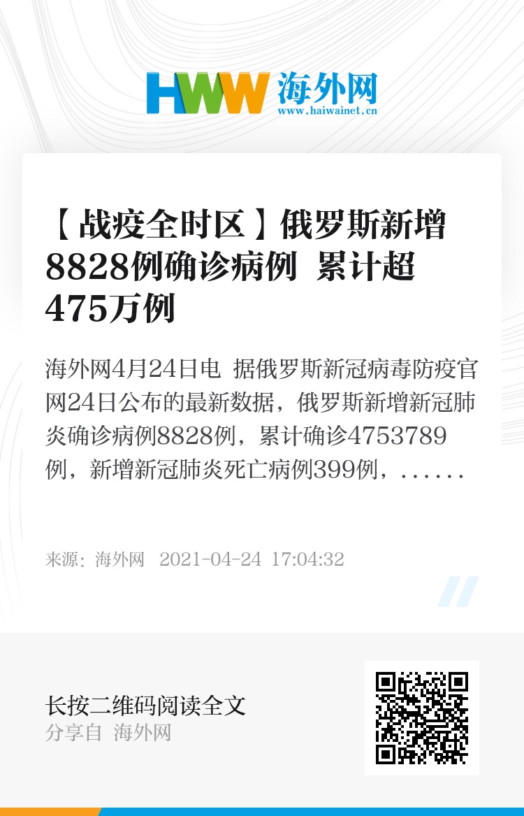海外网4月24日电 据俄罗斯新冠病毒防疫官网24日公布的最新数据,俄罗斯新增新冠肺炎确诊病例8828例,累计确诊4753789例,新增新冠肺炎死亡病例399例,累计死亡107900例。(海外网 赵健行)
