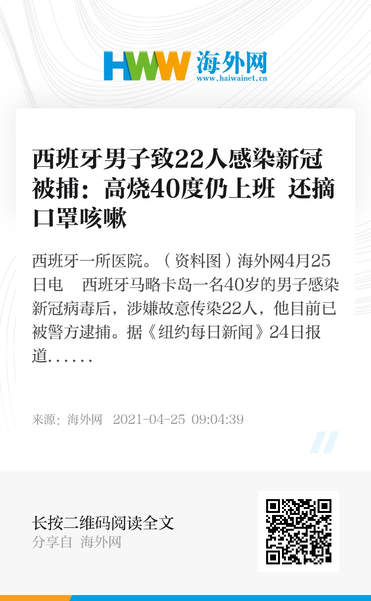 海外网4月25日电 西班牙马略卡岛一名40岁的男子感染新冠病毒后,涉嫌故意传染22人,他目前已被警方逮捕。