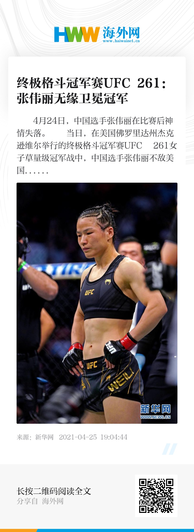 当日,在美国佛罗里达州杰克逊维尔举行的终极格斗冠军赛UFC 261女子草量级冠军战中,中国选手张伟丽不敌美国选手罗斯·娜玛尤纳斯,卫冕失败。