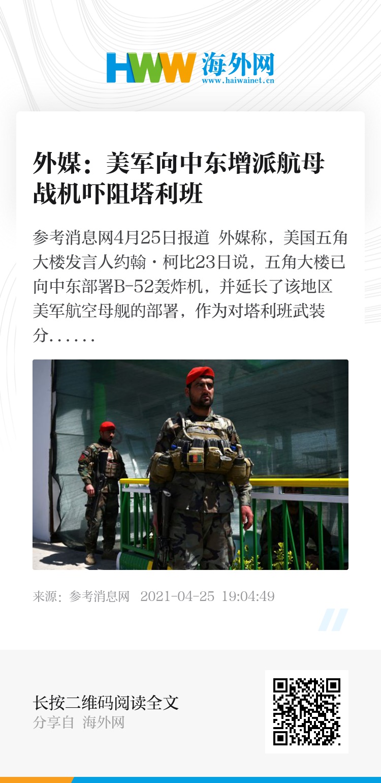 另据美国《华尔街日报》网站4月23日报道,美国官员们表示,白宫23日批准了该航母以及多达6架B-52轰炸机的临时部署,作为美国及北约军队开始撤离阿富汗时对他们提供保护的一种方式。