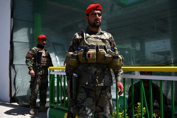 4月21日,阿富汗国民军士兵在喀布尔一处加油站警戒,此地附近不久前曾发生一起针对阿富汗安全部队的炸弹袭击。(法新社)