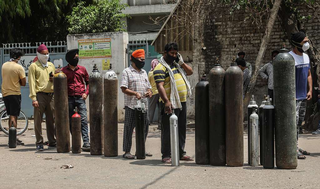 当地时间2021年4月23日,印度新德里,印度当前新冠疫情形势十分严峻,患者家属持空氧气瓶排队等待充氧。图片来源:视觉中国