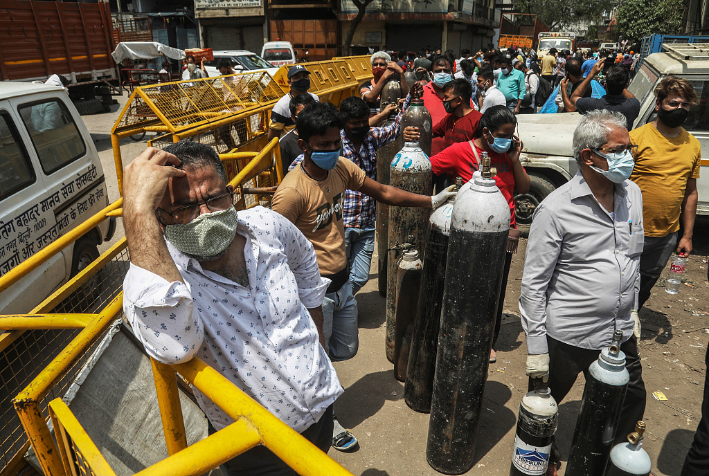 印度日增新冠确诊病例超34万 患者家属排队等待氧气