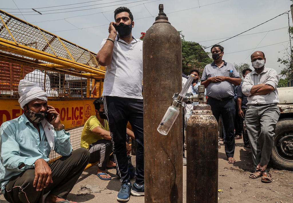 当地时间2021年4月23日,印度新德里,印度当前新冠疫情形势十分严峻,患者家属持空氧气瓶排队等待充氧。图片来源:视觉中国