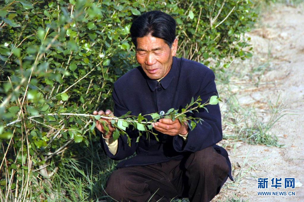 石述柱在甘肃省民勤县宋和村查看树苗长势(2005年5月19日摄)。新华社记者 聂建江 摄