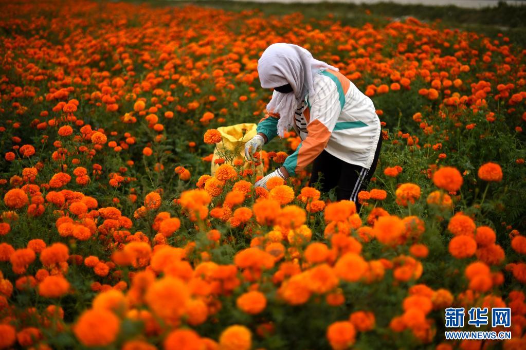 甘肃省民勤县苏武镇农民在采摘万寿菊(2019年8月30日摄)。新华社记者 聂建江 摄