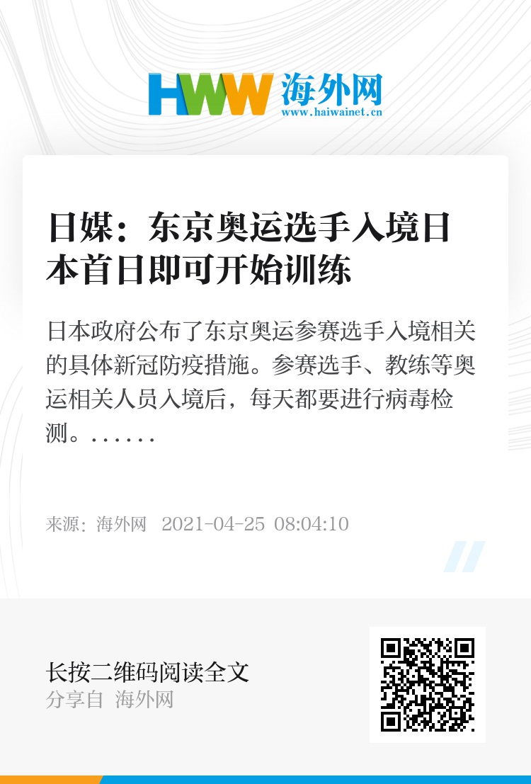 海外网4月25日电 据日本《读卖新闻》25日消息,日本政府公布了东京奥运参赛选手入境相关的具体新冠防疫措施。参赛选手、教练等奥运相关人员入境后,每天都要进行病毒检测,在限定的行动范围内,从入境第一天起可以开始训练,免除通常情况下需隔离14天的规定。但如果违反相关规定,将剥夺运动员参赛资格。
