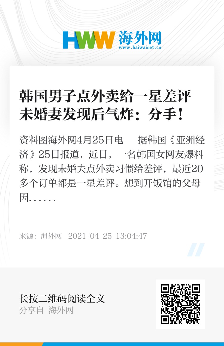海外网4月25日电 据韩国《亚洲经济》25日报道,近日,一名韩国女网友爆料称,发现未婚夫点外卖习惯给差评,最近20多个订单都是一星差评。想到开饭馆的父母因为疫情失业,她气愤不已,最终决定与未婚夫解除婚约。帖文引发巨大争议,有网友表示支持,认为从小事可以看出人品,而且疫情之下餐饮生意难做,应多多理解。也有网友质疑,觉得女方上纲上线,做事太冲动。