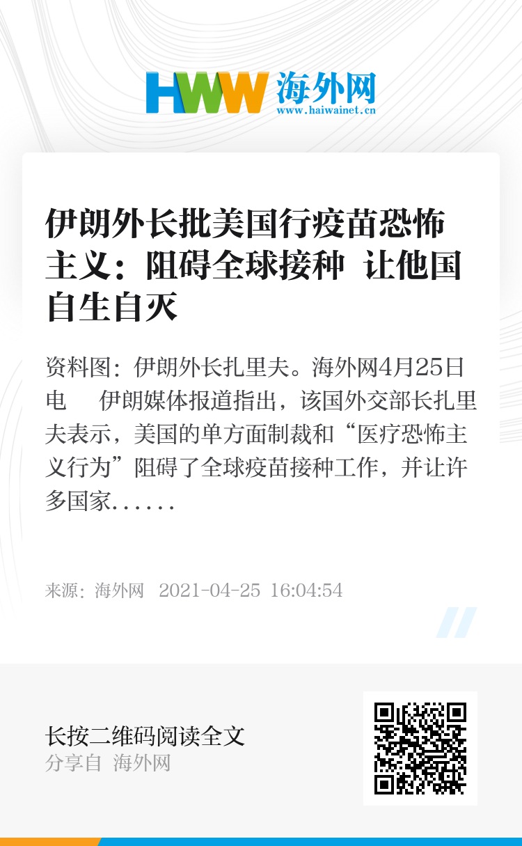 海外网4月25日电 伊朗媒体报道指出,该国外交部长扎里夫表示,美国的单方面制裁和“医疗恐怖主义行为”阻碍了全球疫苗接种工作,并让许多国家在新冠疫情期间自生自灭。