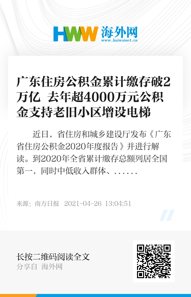 2020年,广东支持职工参加老旧小区现有住宅增设电梯提取住房公积金4306.51万元,占当年提取总额的0.02%,助力改善职工居住环境,提升城市品质。