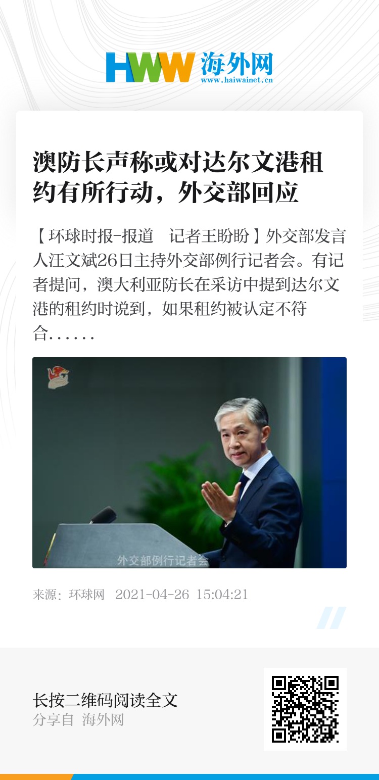 【环球时报-环球网报道 记者王盼盼】外交部发言人汪文斌26日主持外交部例行记者会。有记者提问,澳大利亚防长在采访中提到达尔文港的租约时说到,如果租约被认定不符合澳国家利益,他相信澳方会对此有所行动,请问中方对这个问题有何评论?