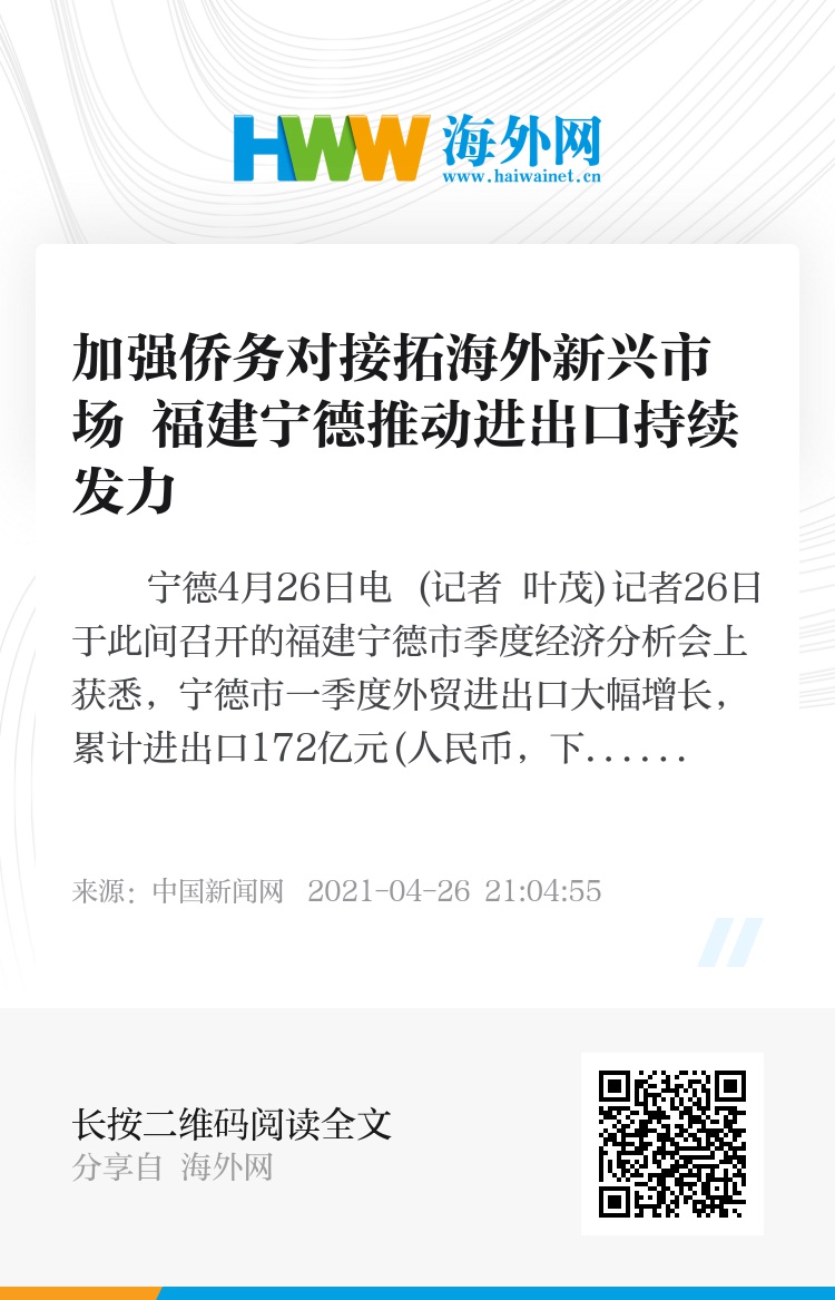 中新网宁德4月26日电 (记者 叶茂)记者26日于此间召开的福建宁德市季度经济分析会上获悉,宁德市一季度外贸进出口大幅增长,累计进出口172亿元(人民币,下同)、增长70.8%,增幅排名全省设区市第三,高出全省36.6个百分点。