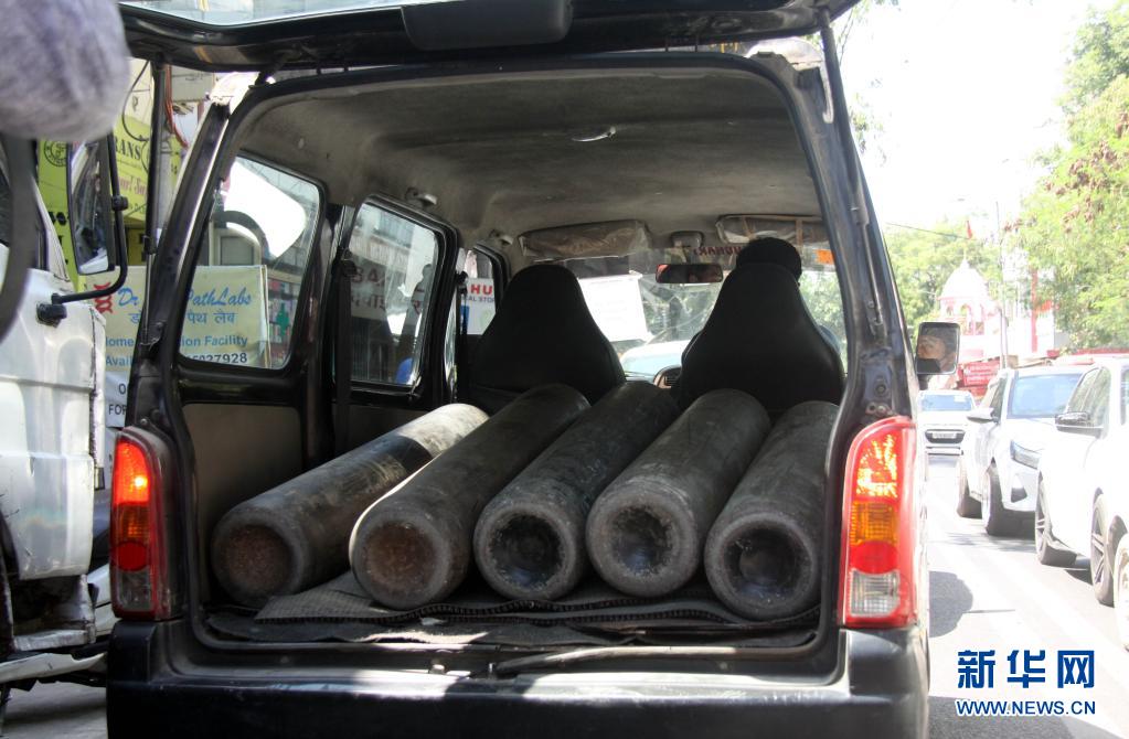 这是4月25日在印度新德里拍摄的氧气瓶。印度首都新德里首席部长凯杰里瓦尔25日宣布,新德里目前正在实施的“封城”措施将延长一周,至5月3日凌晨5时。他说,过去一周,新德里的新冠病毒检测阳性率高达36%至37%,不过25日已下降至29%。新华社发