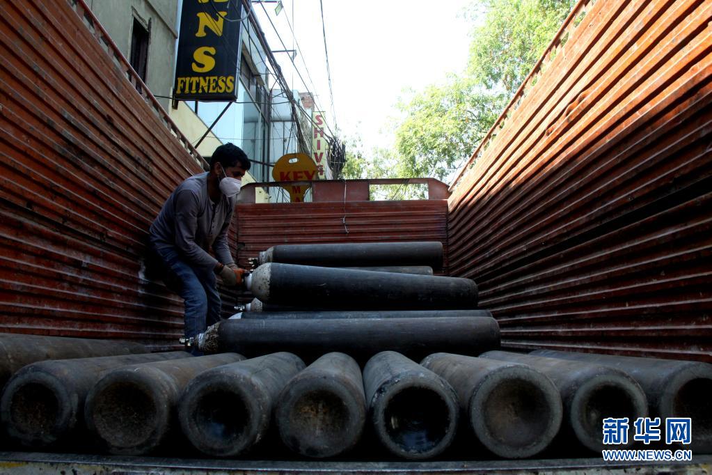4月25日,一名工作人员在印度新德里搬运氧气瓶。印度首都新德里首席部长凯杰里瓦尔25日宣布,新德里目前正在实施的“封城”措施将延长一周,至5月3日凌晨5时。他说,过去一周,新德里的新冠病毒检测阳性率高达36%至37%,不过25日已下降至29%。新华社发