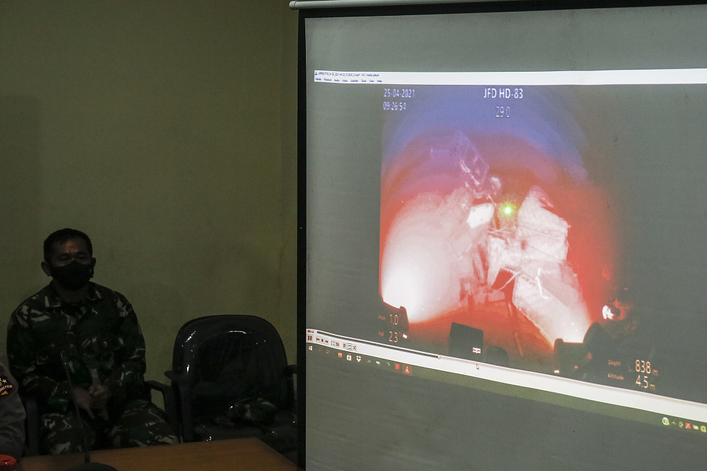 当地时间2021年4月25日,印度尼西亚库塔,印尼军人展示失联潜艇的部分残骸。图片来源:人民视觉