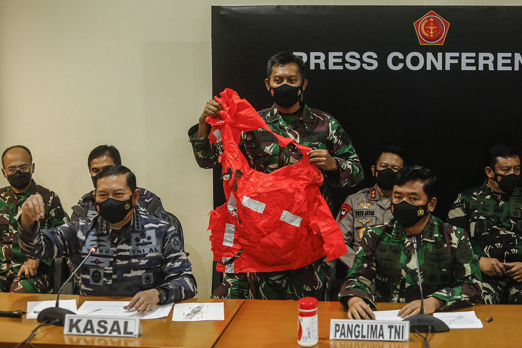 当地时间2021年4月25日,印度尼西亚库塔,印尼军人展示失联潜艇船员救生衣。图片来源:人民视觉