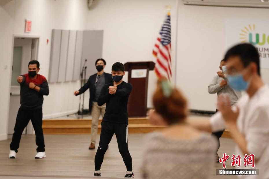 当地时间4月25日,美国纽约法拉盛亚裔社区自发成立的“公共安全巡逻队”队员以及部分民众,在该社区活动中心进行防卫术训练,提高安防能力。中新社记者 廖攀 摄