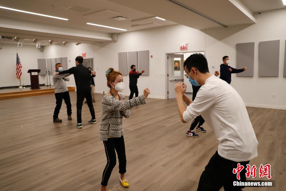 当地时间4月25日,美国纽约法拉盛亚裔社区自发成立的“公共安全巡逻队”队员以及部分民众,在该社区活动中心进行防卫术训练,提高安防能力。中新社记者 廖攀 摄
