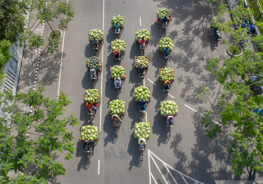 孟加拉工人三轮车内装满西瓜 整齐列队骑行好似阅兵方阵