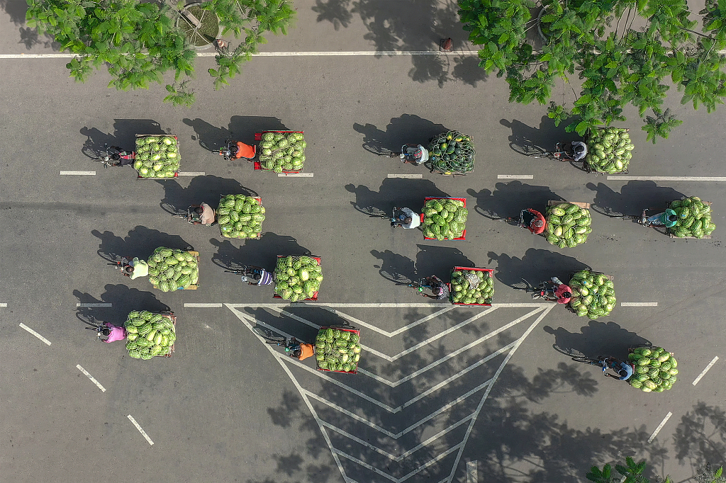 孟加拉工人三轮车内装满西瓜 整齐列队骑行好似阅兵方阵