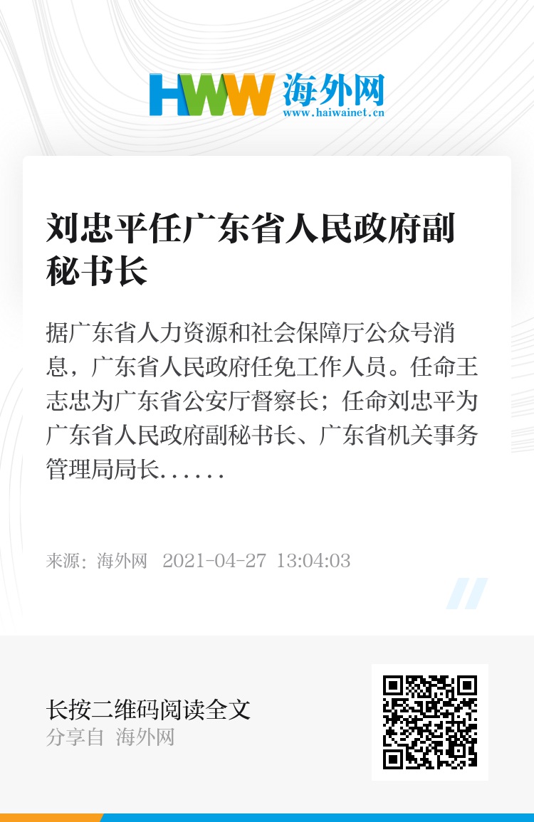 任命刘忠平为广东省人民政府副秘书长、广东省机关事务管理局局长;