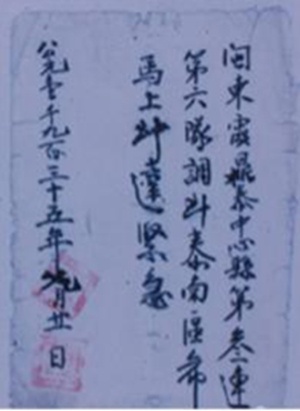 “闽东霞鼎泰中心县第三连第六队调到泰南区,希马上到达。紧急。公元一千九百三十五年九月二十一日。”