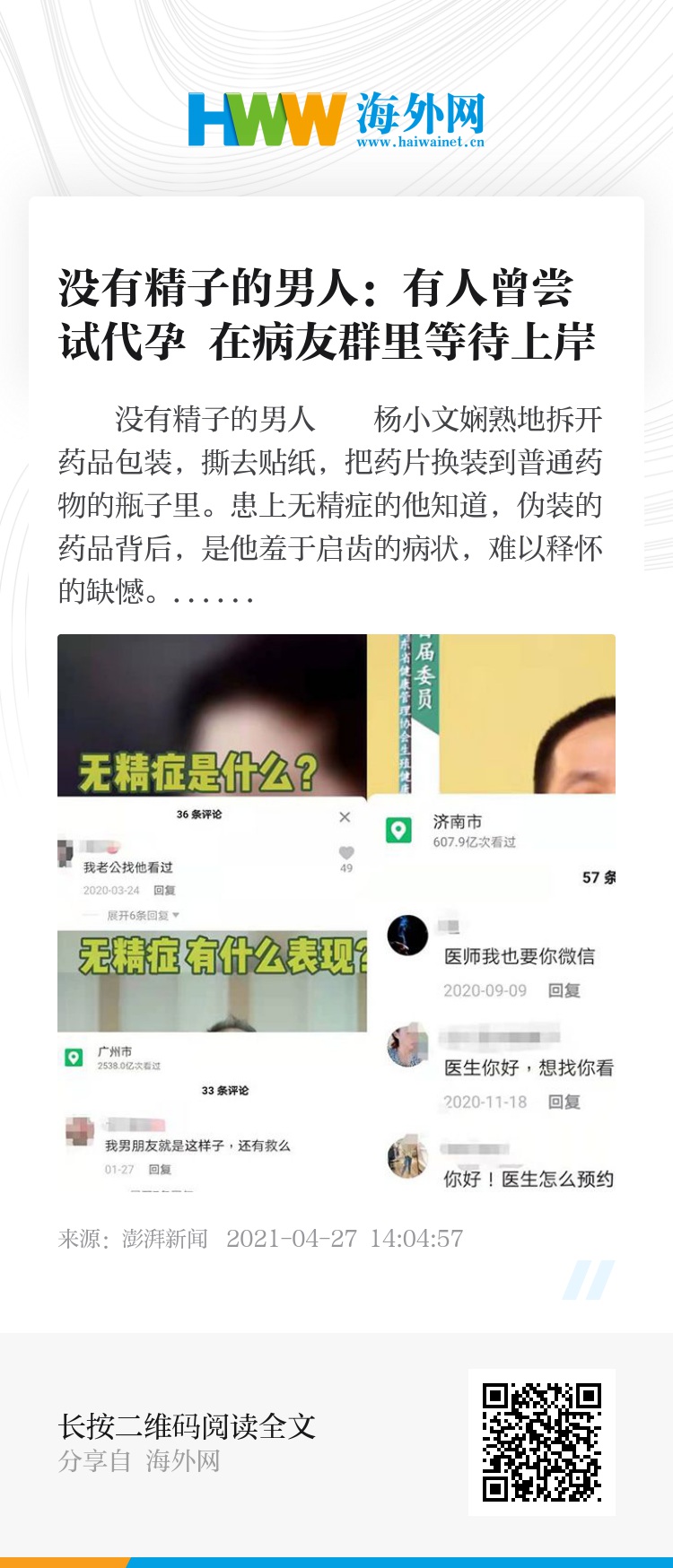 同样患过腮腺炎的谭千在北京顺义的一家医院里得知自己有无精症,“心情特别沉重,就担心他们的诊断是对的”。他又先后换了四五家医院检查,“每次我去之前还有一丝希望,可能别的医院查不到(精子),这家医院能查出来。”