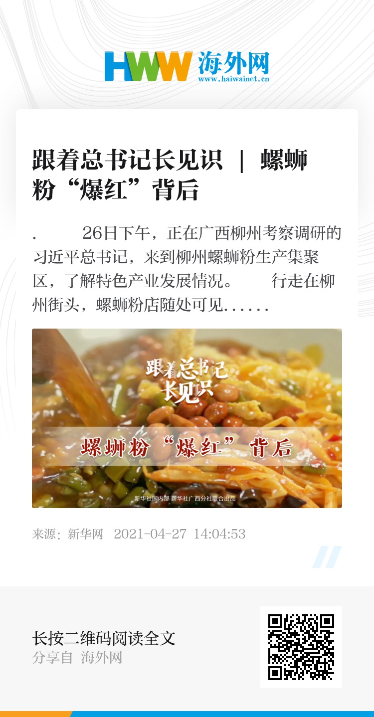 26日下午,正在广西柳州考察调研的习近平总书记,来到柳州螺蛳粉生产集聚区,了解特色产业发展情况。