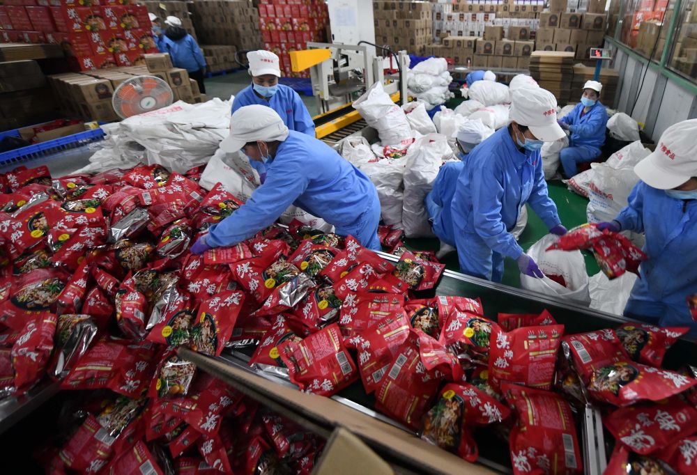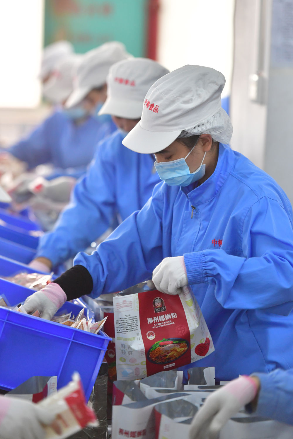 在柳州市螺蛳粉产业园广西中柳食品科技有限公司生产车间,工人在生产线上包装螺蛳粉(2月2日摄)。新华社记者 黄孝邦 摄